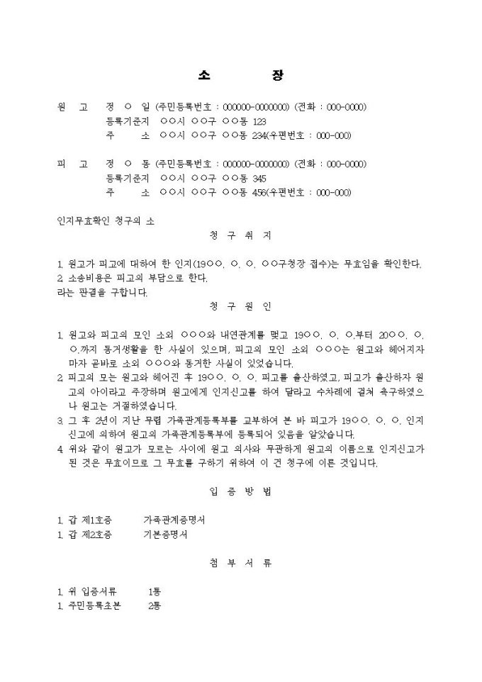 인지무효확인 청구의 소장(원고의 의사에 반한 인지신고)(3)입니다.