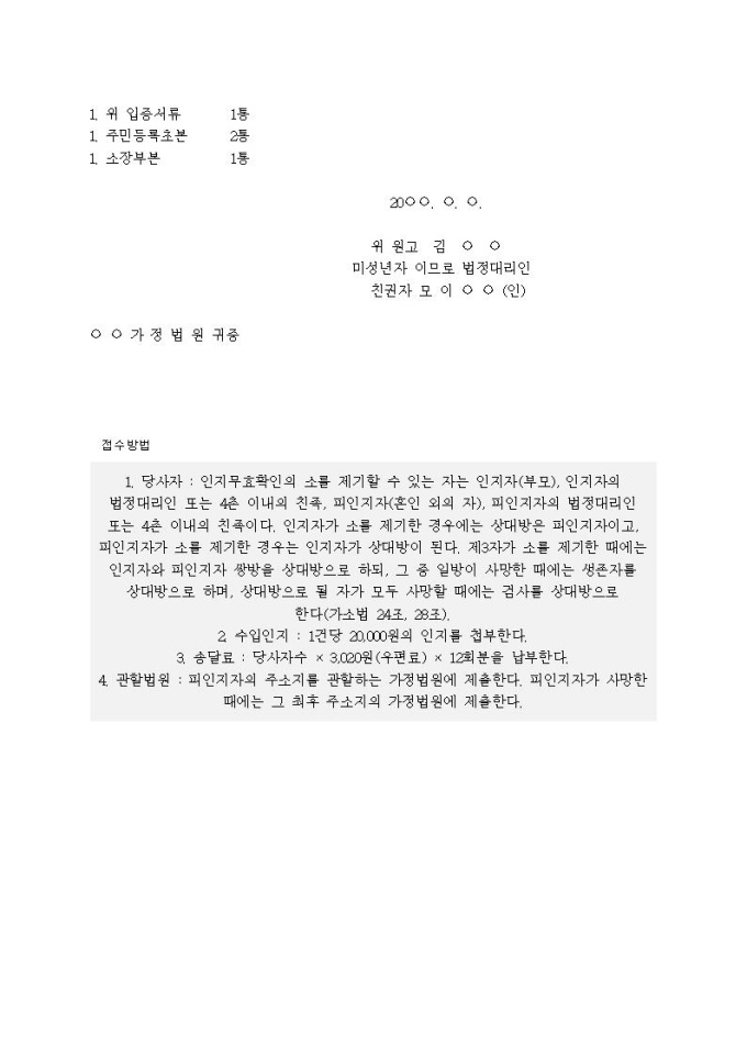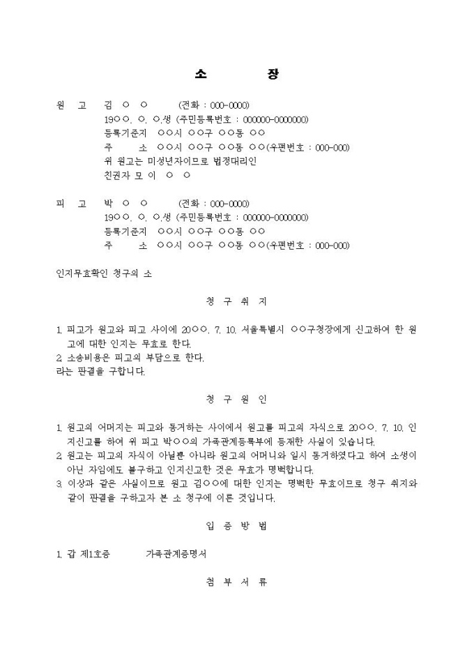 9,000원/월인지무효확인 청구의 소장(일시동거를 이용한 인지신고)입니다.