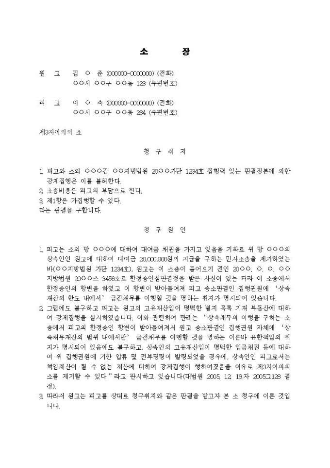 9,000원/월제3자이의의 소장(한정승인자의 대응)(민사사건임)입니다.