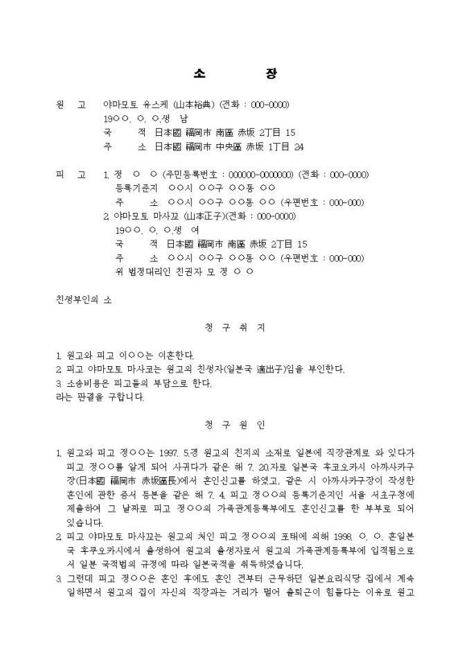 친생부인의 소장