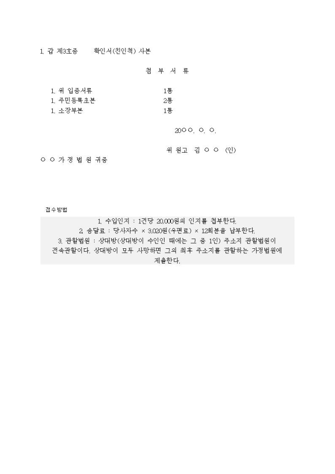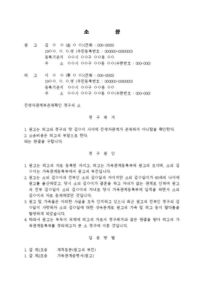 친생자관계 부존재확인 청구의 소장(자녀가 없는 관계로 입적)
