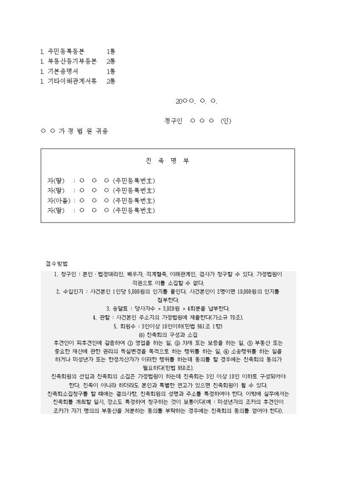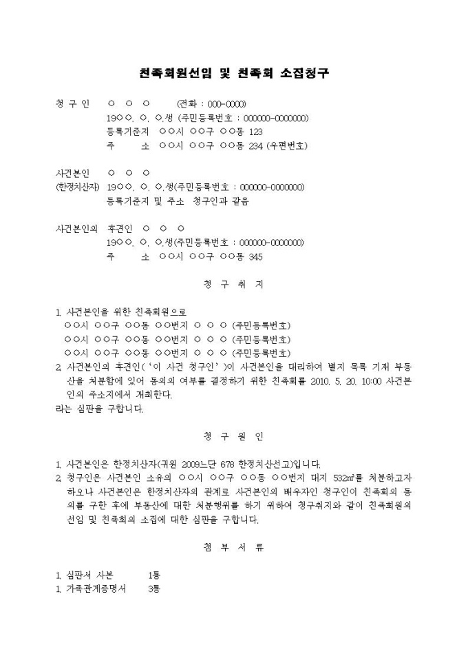 친족회원선임 및 친족회 소집청구서(부동산 처분시)