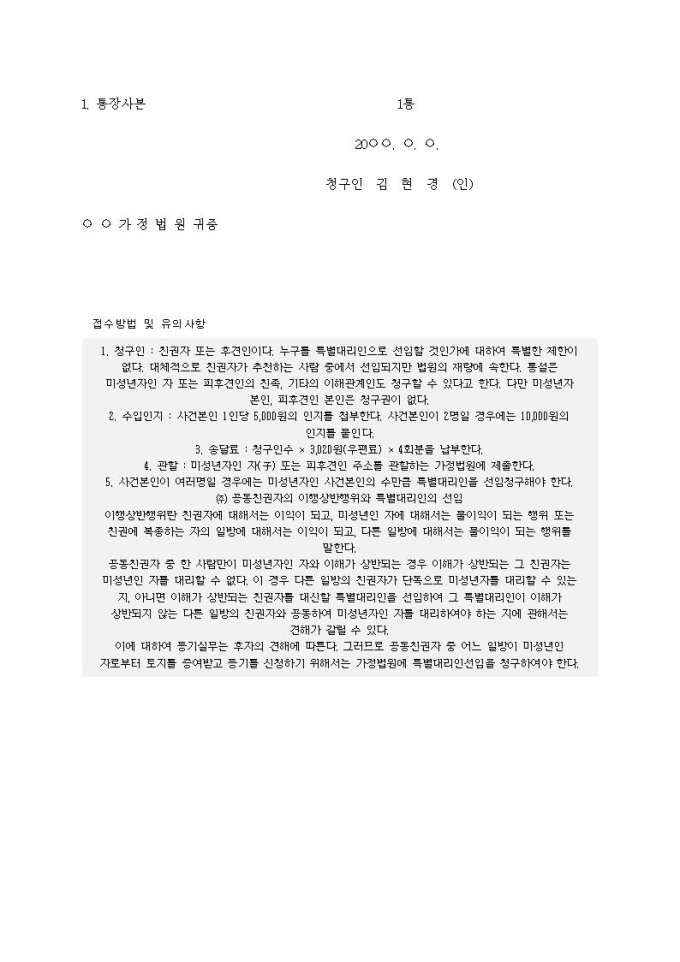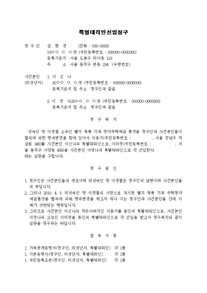 9,000원/월특별대리인 선임청구서(청약주택예금통장에 대한 명의변경절차)입니다.