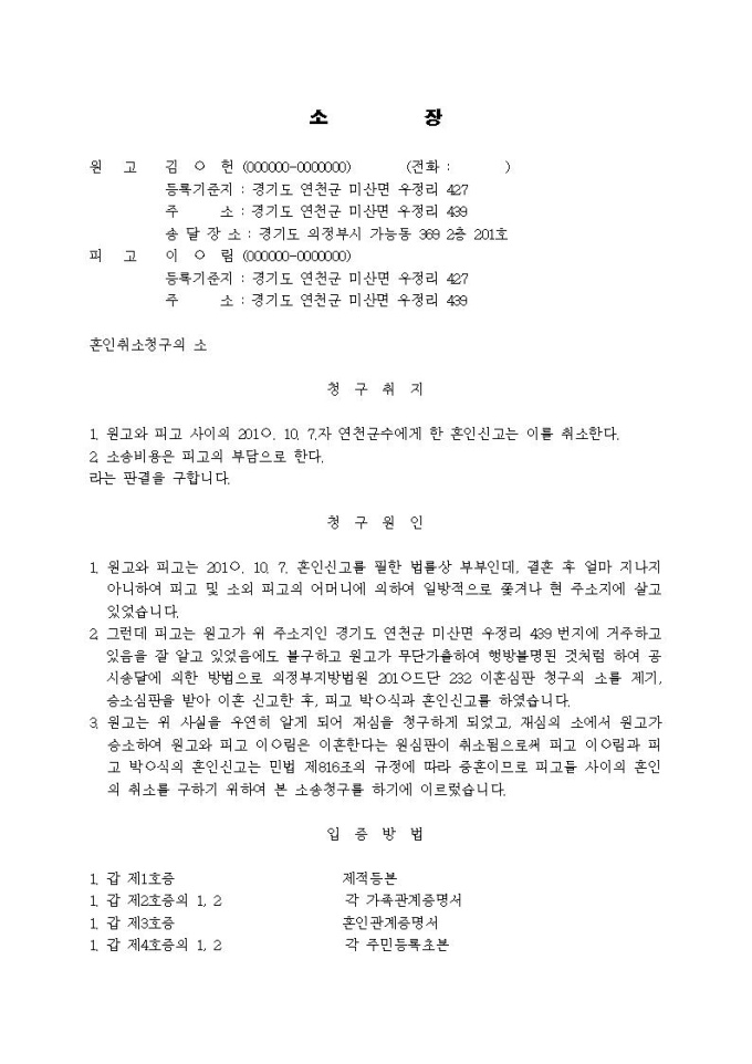9,000원/월혼인취소 청구의 소장(중혼을 이유로)입니다.