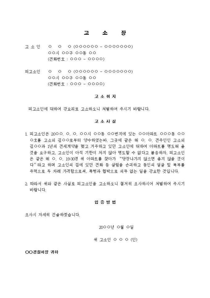 (고소장)강요죄(아파트 양수 후 명도요구)