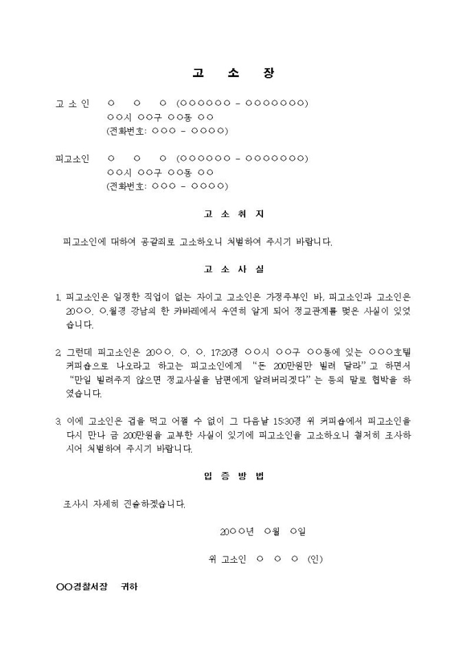 9,000원/월(고소장)공갈죄(정교사실을 이용 금품갈취)입니다.