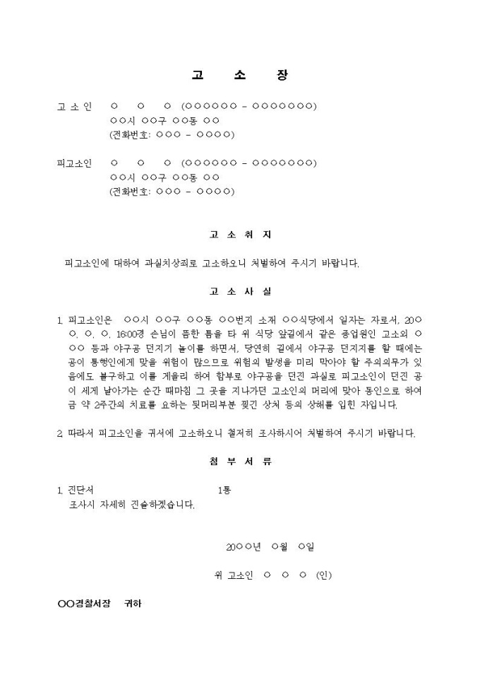 (고소장)과실치상죄(야구공 던지기 놀이)