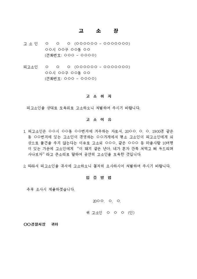 9,000원/월(고소장)모욕죄(물품대금 외상거절로 인함)입니다.