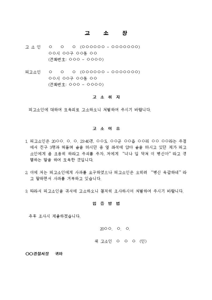 9,000원/월(고소장)모욕죄(주점에 술을 마시던 중)입니다.