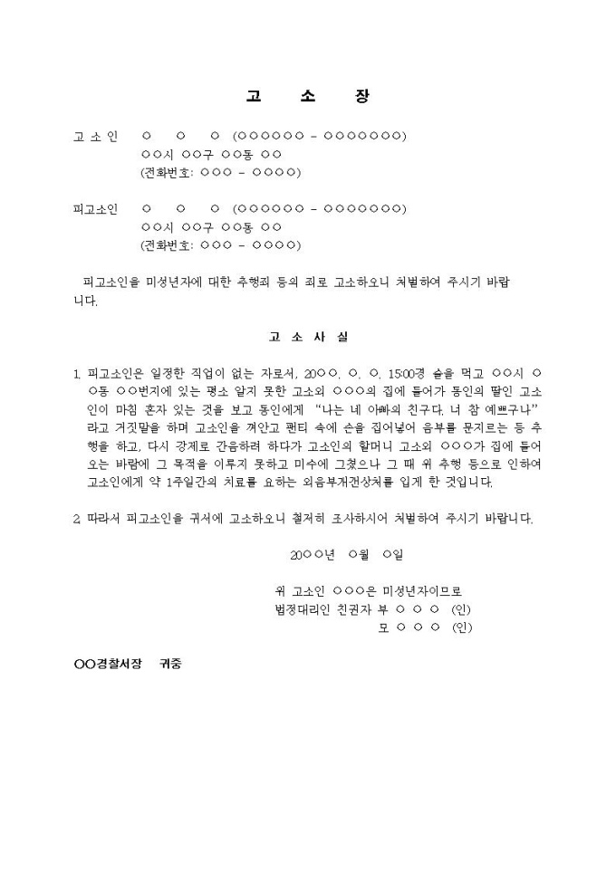 (고소장)미성년자에 대한 추행죄 등 (집안에 혼자 있음을 알고 추행)입니다.
