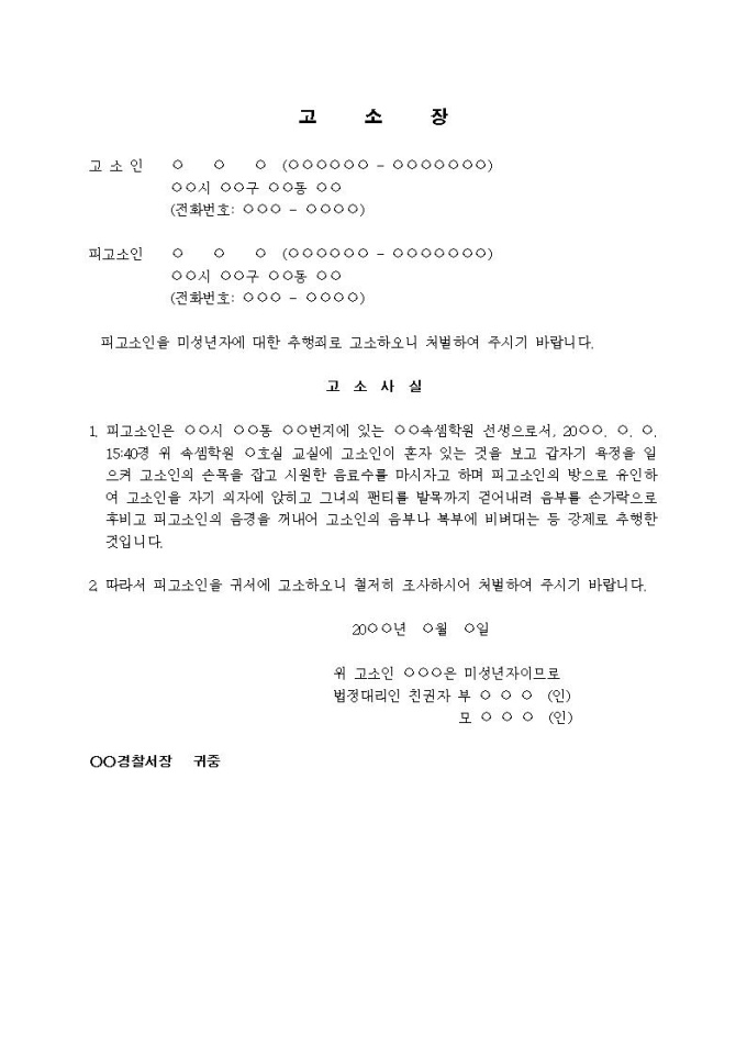 9,000원/월(고소장)미성년자에 대한 추행죄(학원에서 혼자 있음을 알고 추행)입니다.
