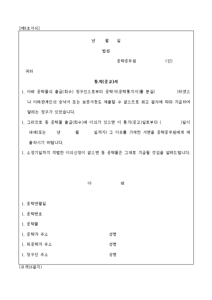 제9호서식 공탁금 통지 공고 양식입니다. 다음의 내용을 기입합니다. 1. 공탁연월일 1. 공탁번호 1. 공탁물 1. 공탁자 주소 1. 피공탁자 주소 1. 청구인 주소