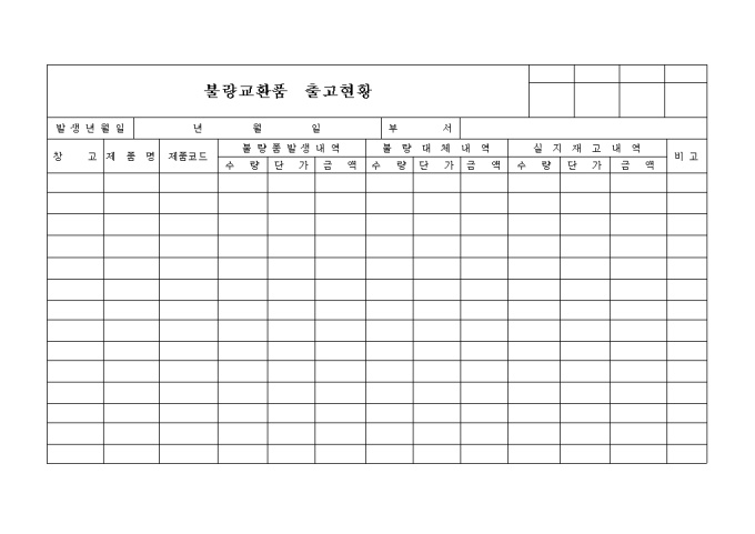 9,000원/월제품별 불량품발생내역과 태체내역,재고내용등의 세부항목으로 구성된 불량교환 품출고현황 양식입니다.