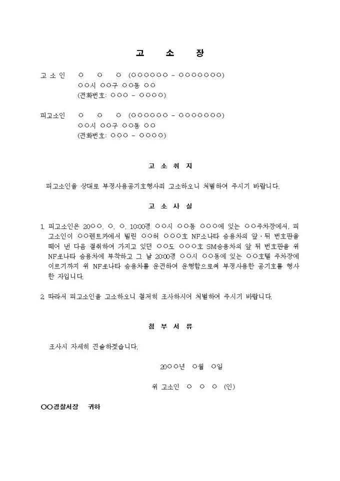(고소장)부정사용공기호행사죄(자동차번호판)입니다.