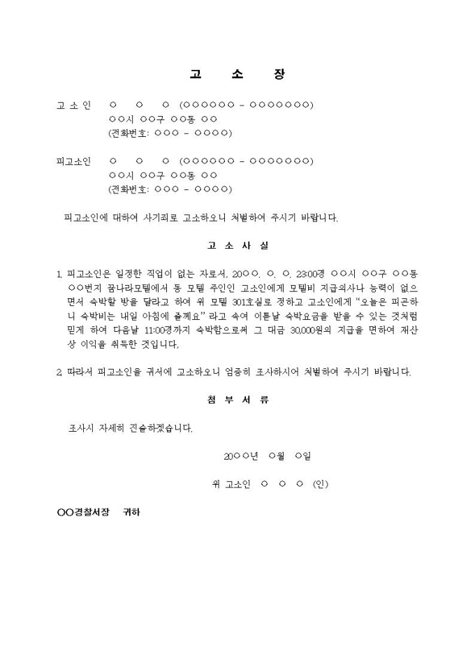 (고소장)사기죄(모텔 숙박비 편취)입니다.