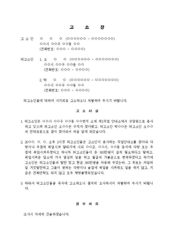 (고소장)사기죄(직업소개업자로부터 선불금 명목으로 편취)입니다.