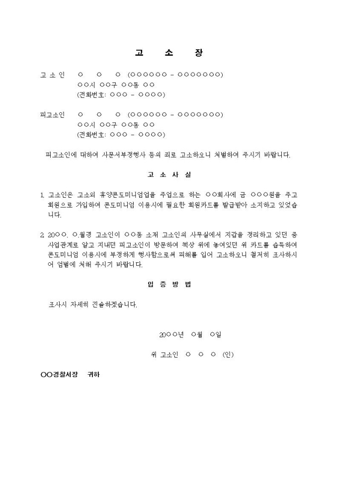 (고소장)사문서부정행사죄 등(카드습득 부정사용)입니다.