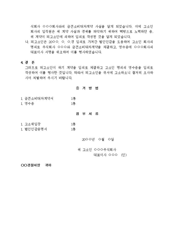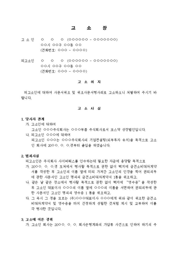 (고소장)사문서위조 등(금전소비대차 및 영수증 위조)입니다.
