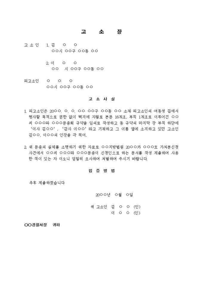 (고소장)사문서위조죄(문중회 규약 임의작성)입니다.