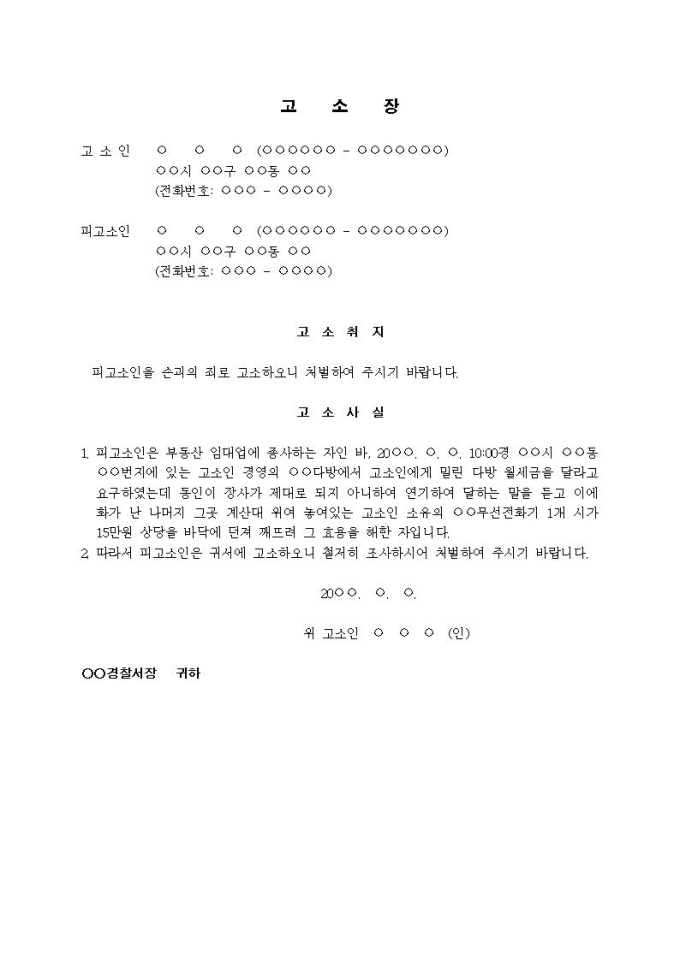 9,000원/월(고소장)손괴의 죄(월세금 독촉하자 무선전화기 파손)입니다.