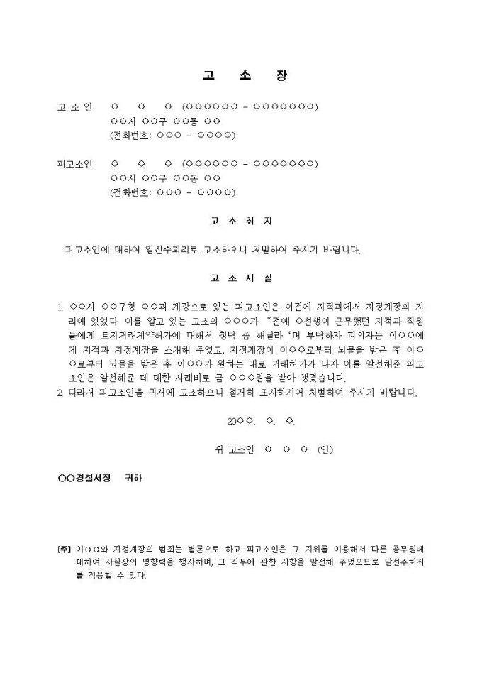 (고소장)알선수뢰죄(토지거래허가계약 청탁)입니다.