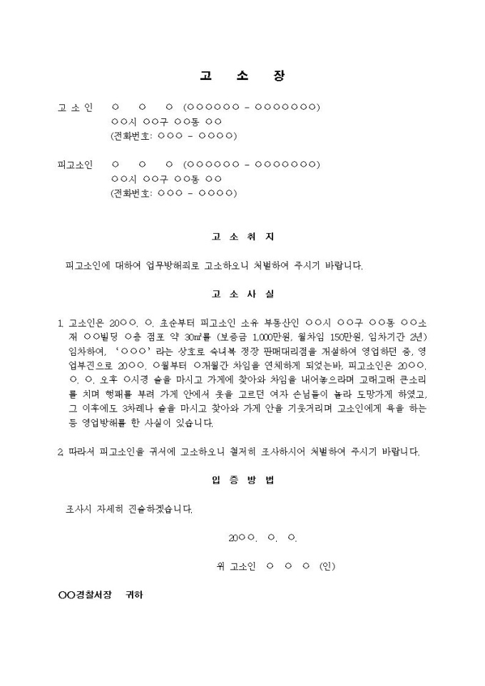 (고소장)업무방해죄(숙녀복매장 차임 연체하자 영업방해)입니다.