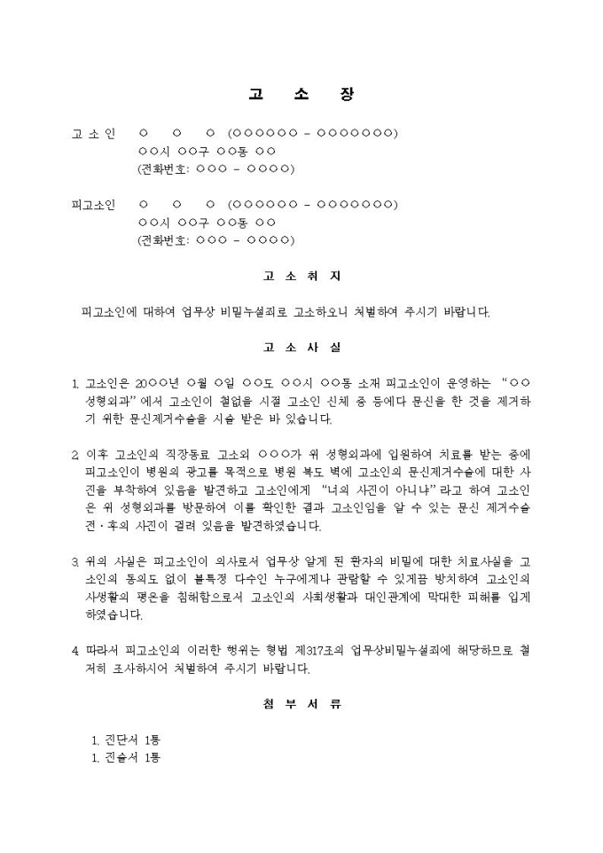 (고소장)업무상 비밀누설죄(의사가 환자 문신 누설)