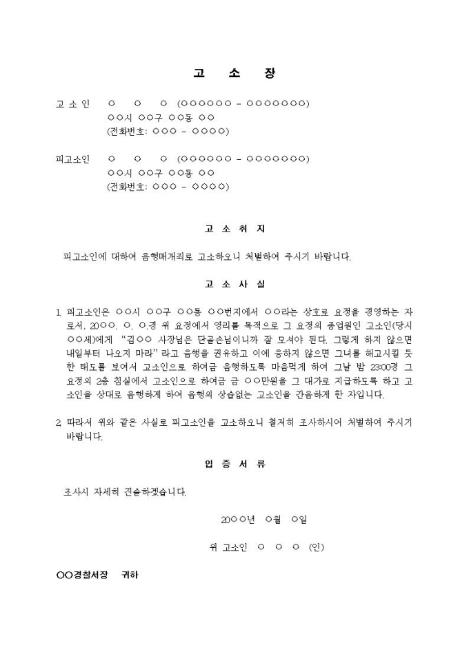 (고소장)음행매개죄(요정에서 상습없는 종업원 간음강요)입니다.