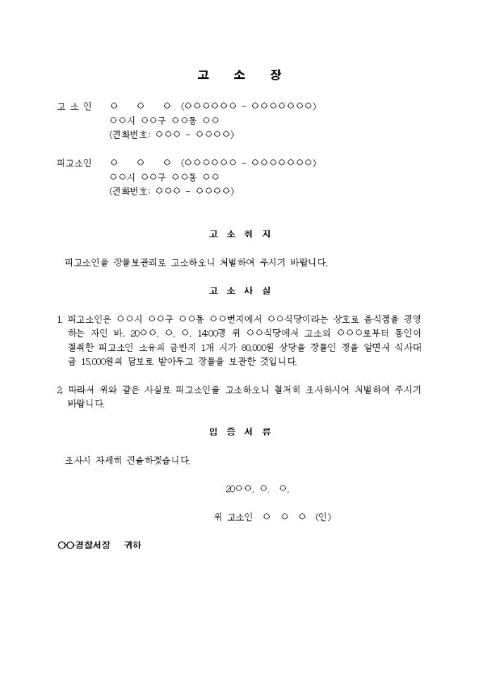 (고소장)장물보관죄(절취한 금반지 보관)