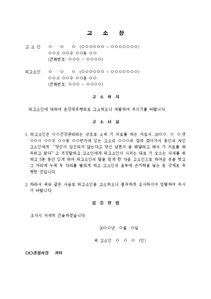 (고소장)준강제추행죄(기 치료를 이용하여 추행)입니다.