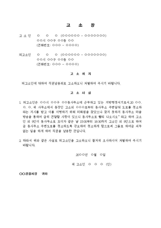 (고소장)직권남용죄(공무원이 마을사람들을 동원 청소 강요)