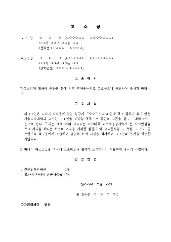 (고소장)출판물 등에 의한 명예훼손죄(월간지에 교수채용비리 적시)