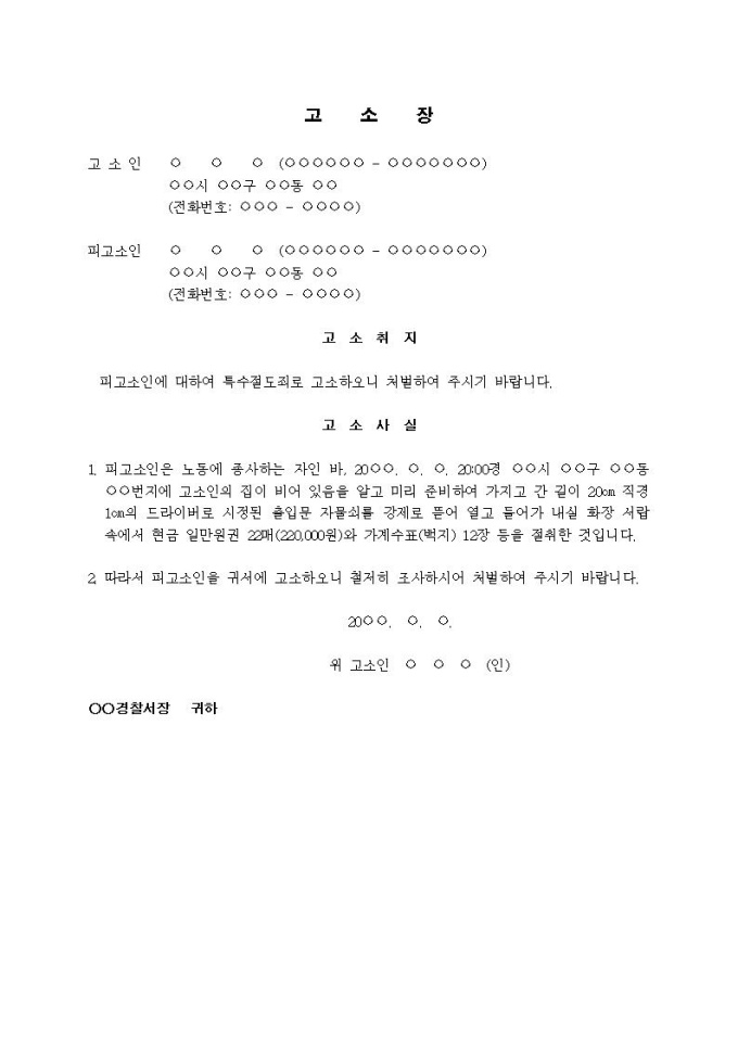 (고소장)특수절도죄(드라이버를 이용하여 현금, 수표절취)입니다.