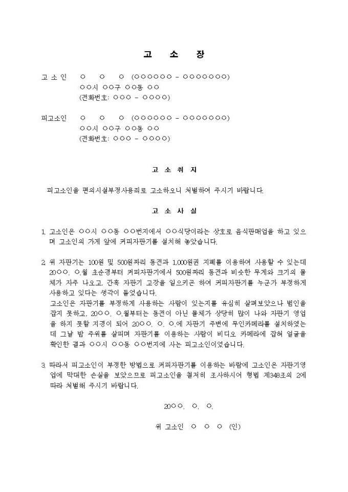 (고소장)편의시설부정사용죄(고객이 커피자판기 훼손)입니다.