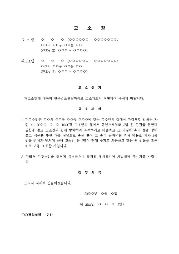 (고소장)현주건조물방화죄(가정부가 강간을 당하자 방화)