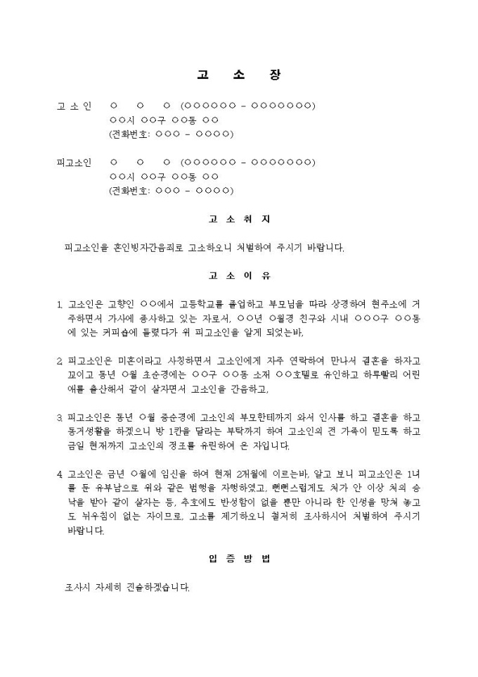 (고소장)혼인빙자간음죄(유부남이 미혼이라 속이고 간음)