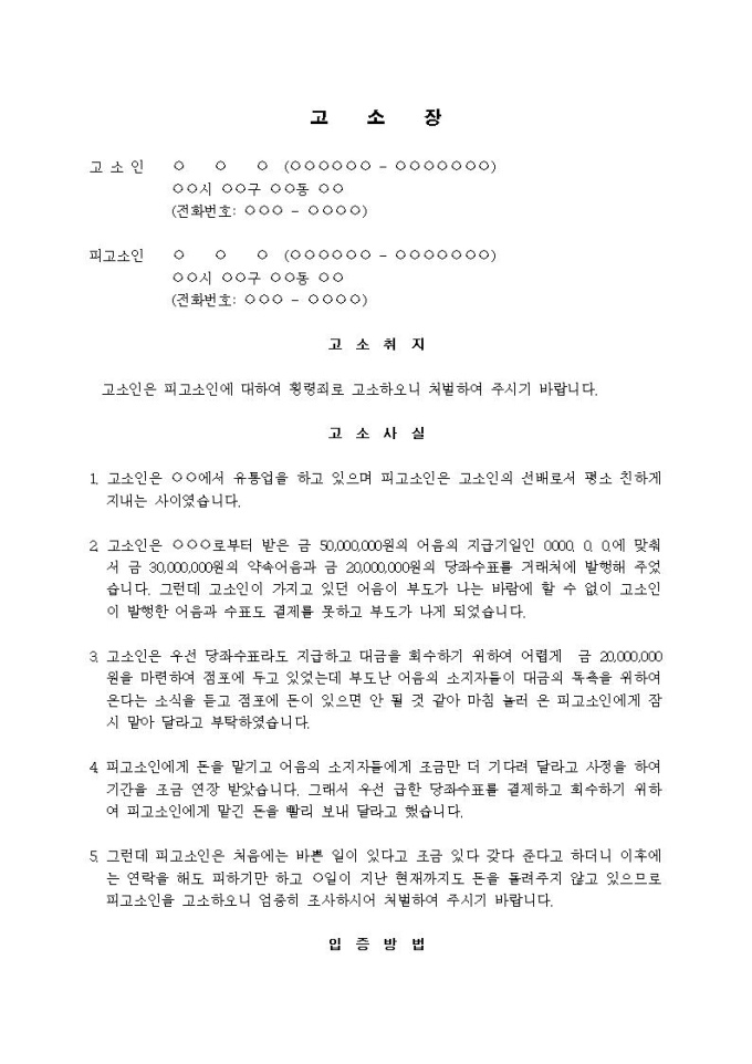 (고소장)횡령죄(당좌수표 회수하기 위해 채무독촉하자 이행하지 않음)입니다.