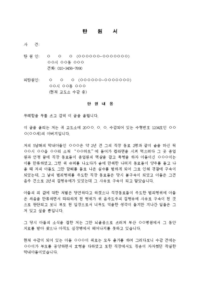 (탄원서)아버지가 아들의 석방촉구입니다.