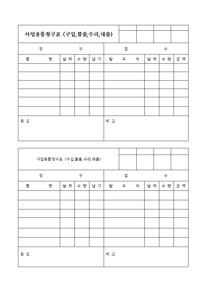 필요한 사업용품을 청구할때 사용하는 사업용품청구표(구입, 불출, 수리, 대출) 양식입니다.
