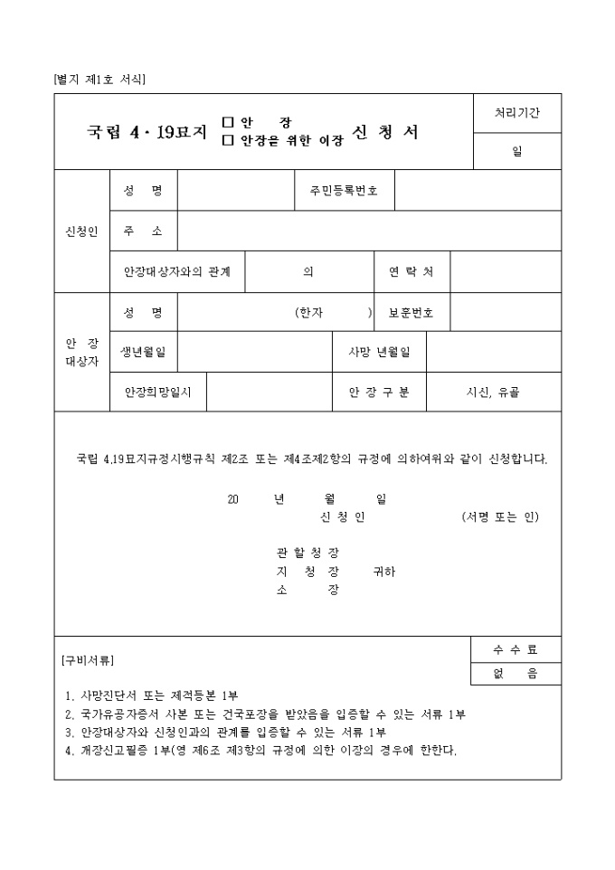 국립 4.19묘지규정시행규칙 제2조 또는 제4조제2항의 규정에 의하여 안장 혹은 안장을 위한 이정을 신청하고자 할 때 쓰이는 양식입니다.