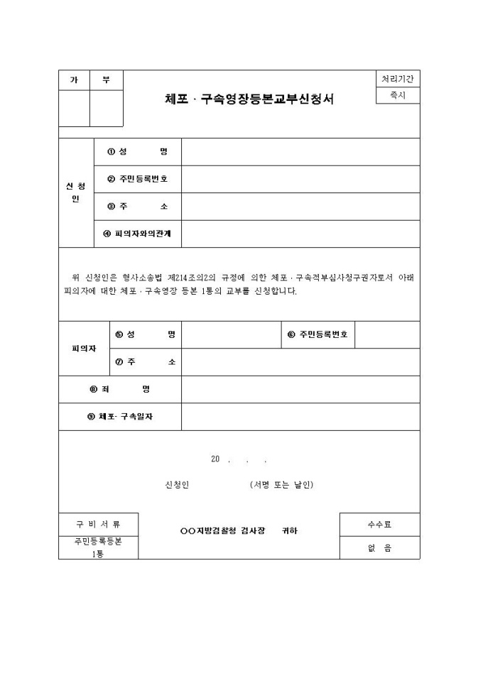 9,000원/월체포·구속영장등본교부신청서입니다.