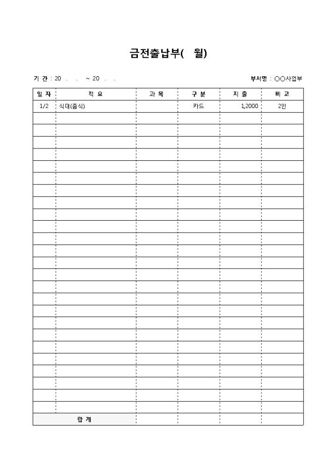 9,000원/월금전출납부(일자별)입니다. 일자, 적요, 과목, 구분, 지출, 비고 등의 항목으로 구성되어 있습니다.