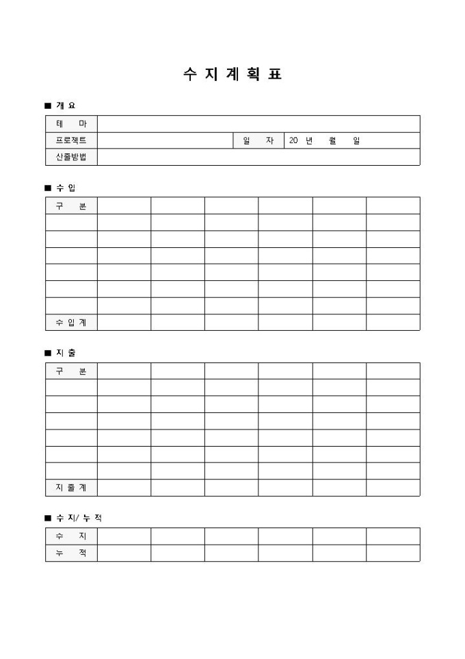 수지계획표입니다. 개요, 수입, 지출, 수지/누적 등의 항목으로 구성되어 있습니다.