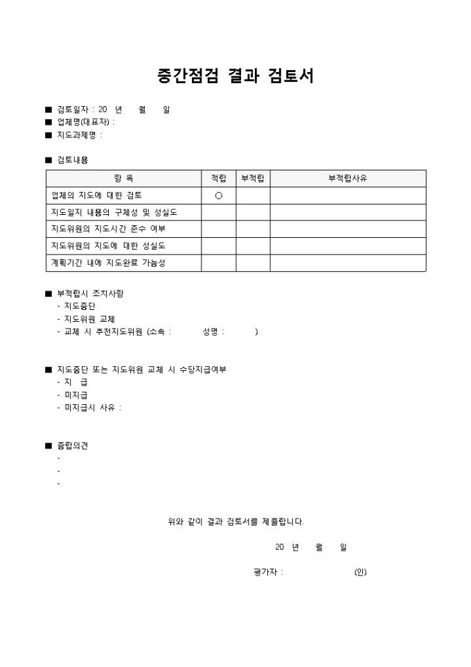 중간점검결과 검토서입니다. 검토일자, 업체명, 지도과제명, 검토내용, 부적합시 조치사항 등의 항목으로 구성되어 있습니다.