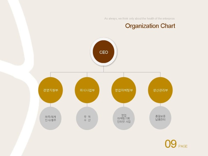 유통 및 식품가공 분야의 9번째 프리미엄 파워포인트 디자인입니다. 제안서, 회사소개서, 기획서용 파워포인트 디자인으로 샘플 내용은 표준 회사소개서의 목차에 맞게 제작되었습니다.기존PPT와 차별화된 고급스러운 디자인이 필요할때! 높은 품질에 저렴한 가격! 포토샵을 못해도 누구나 고급스러운 디자인과 편리함을 이용하실 수 있습니다.