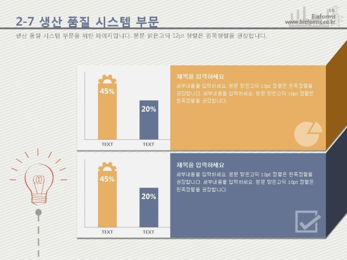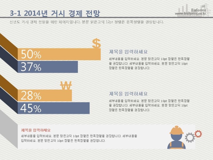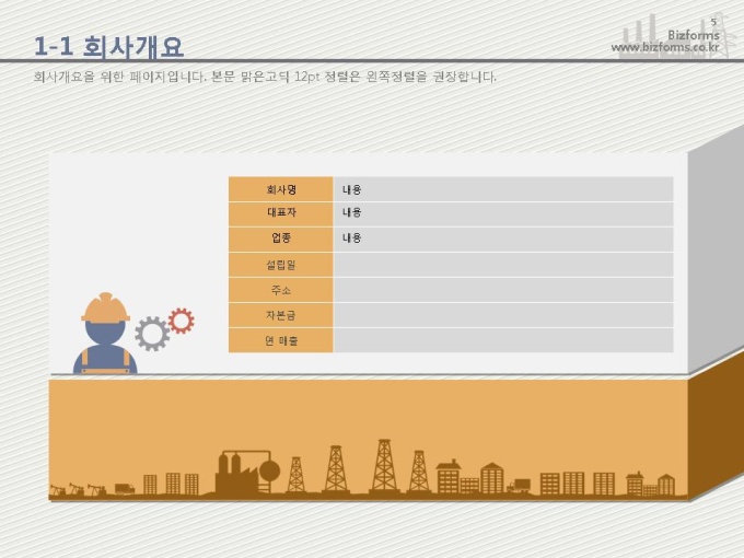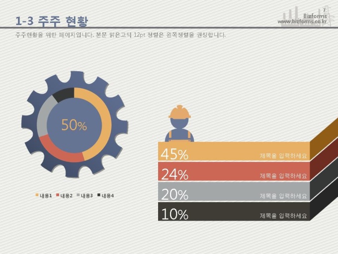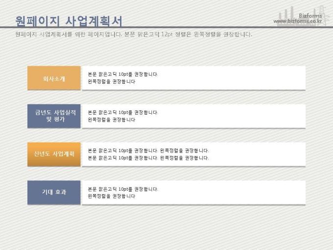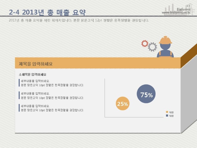 어느 분야에도 적용이 되는 표준 목차 및 전문가 조언, 한눈에 보여주는 원페이지 요약본, 숫자만 입력하면 자동 완성되는 자동차트, 프레젠테이션에 활용 할 수 있는 이미지소스가 포함되어 있습니다.