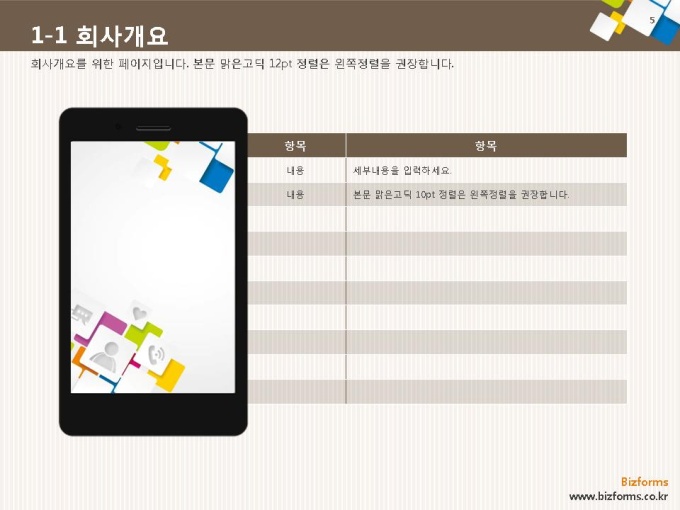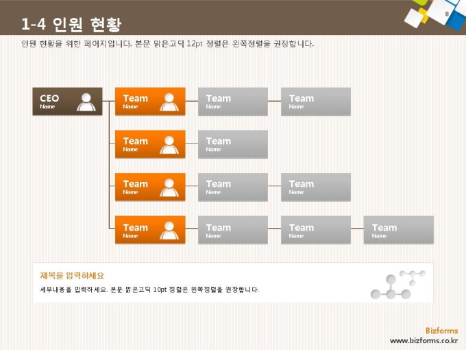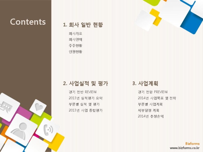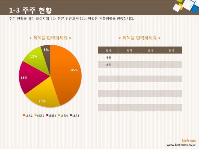 어느 분야에도 적용이 되는 표준 목차 및 전문가 조언, 한눈에 보여주는 원페이지 요약본, 숫자만 입력하면 자동 완성되는 자동차트, 프레젠테이션에 활용 할 수 있는 이미지소스가 포함되어 있습니다.