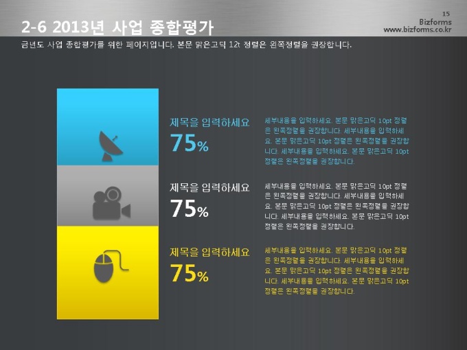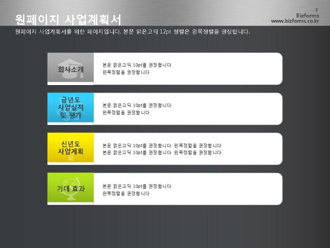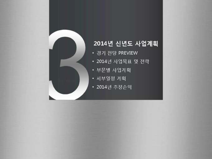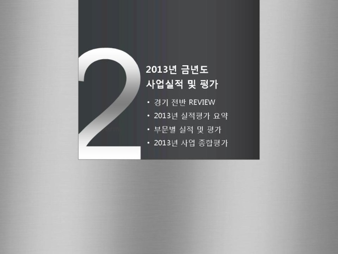 표준 신년도 사업계획서는 파워포인트2007버전(pptx) 이상에서 최적화 되어 있으며, 2003버전(ppt)에서는 일부 사용이 제한됩니다.