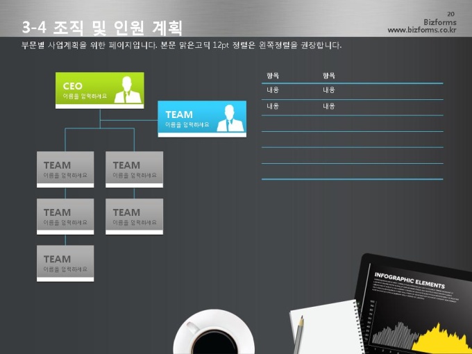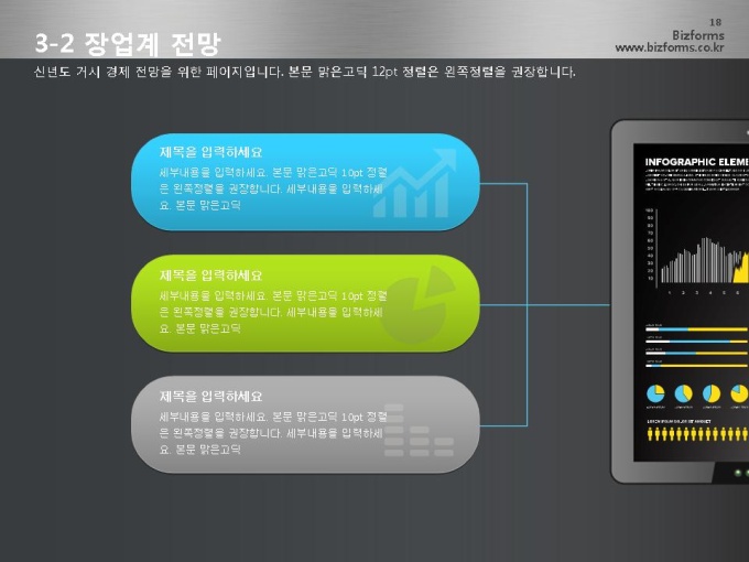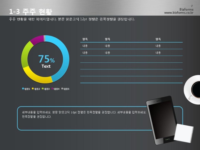 어느 분야에도 적용이 되는 표준 목차 및 전문가 조언, 한눈에 보여주는 원페이지 요약본, 숫자만 입력하면 자동 완성되는 자동차트, 프레젠테이션에 활용 할 수 있는 이미지소스가 포함되어 있습니다.