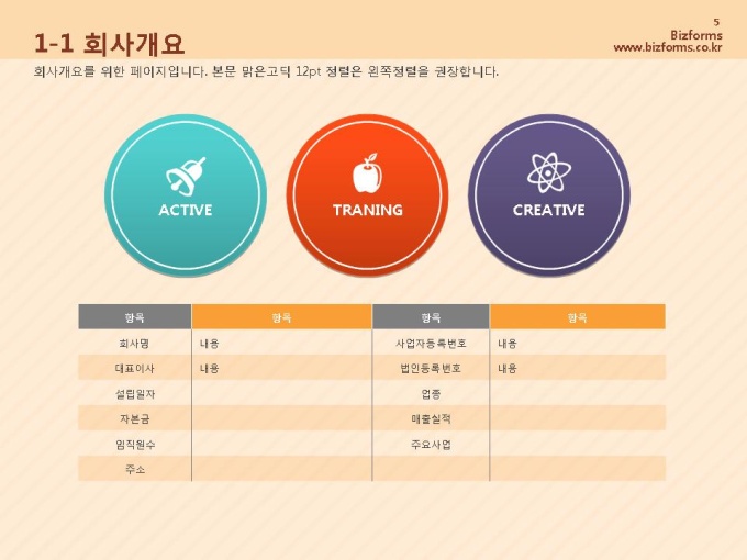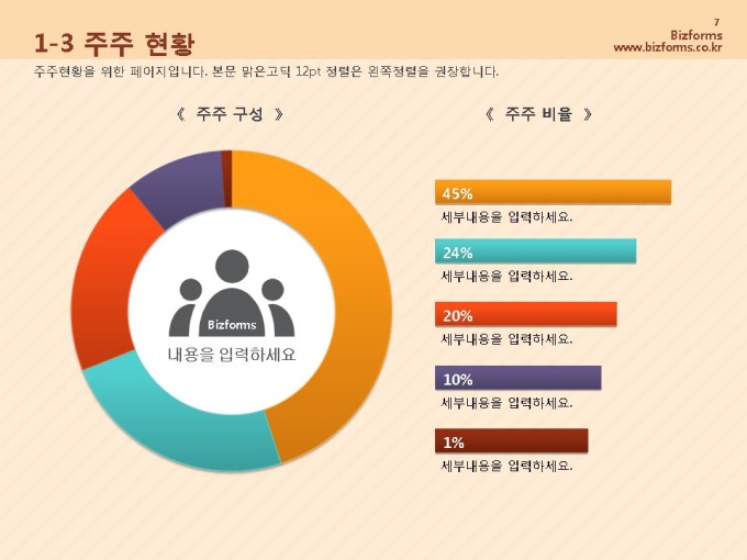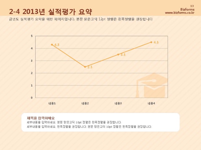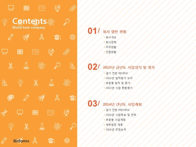 어느 분야에도 적용이 되는 표준 목차 및 전문가 조언, 한눈에 보여주는 원페이지 요약본, 숫자만 입력하면 자동 완성되는 자동차트, 프레젠테이션에 활용 할 수 있는 이미지소스가 포함되어 있습니다.